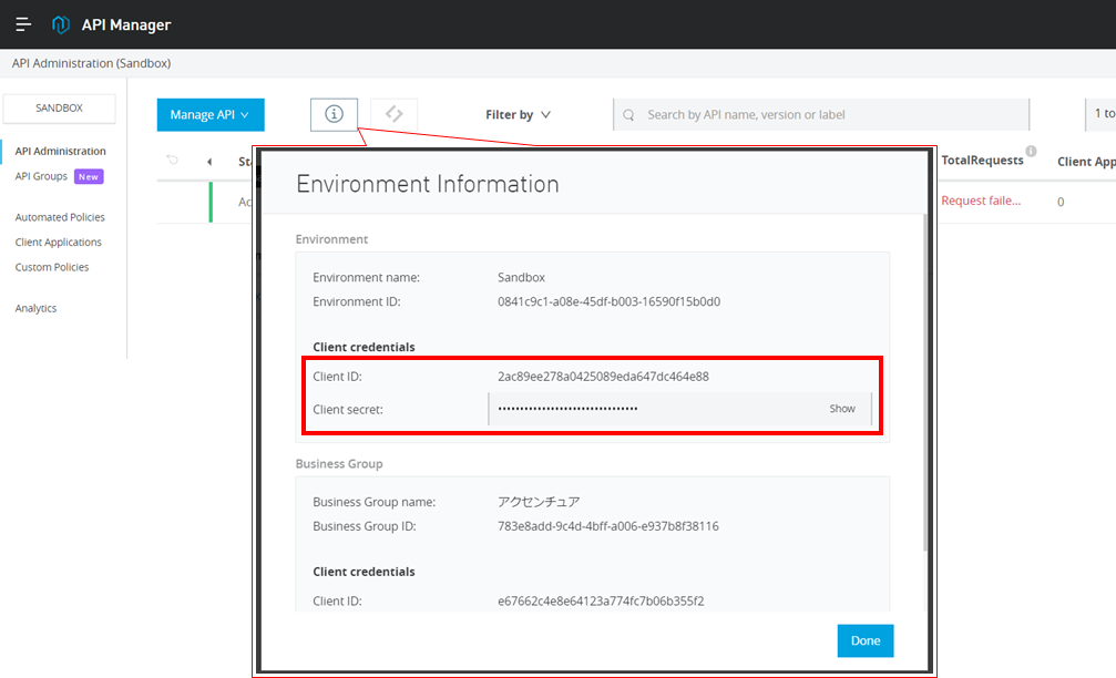 API Managerの一覧画面の『i』をクリックして、環境のクライアントIDとシークレットを確認する。