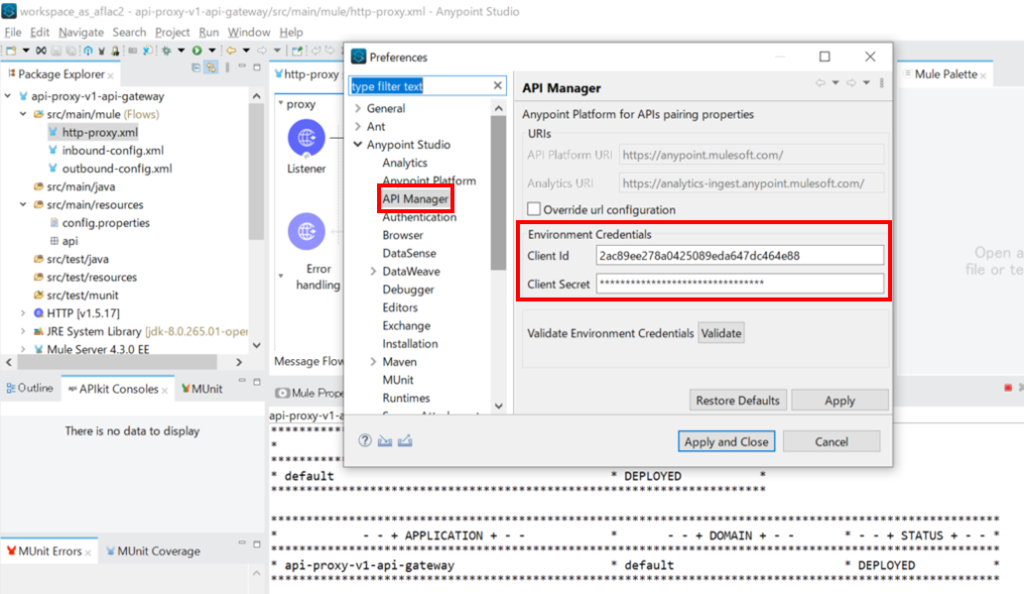 - AnypointStudioのAPI Managerに環境のクライアントIDとシークレットを設定する。