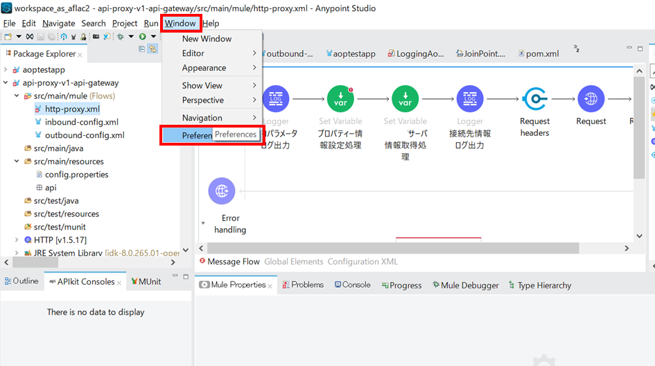 AnypointStudioのヘッダーメニューから[Window]> [Preference]をクリックする。