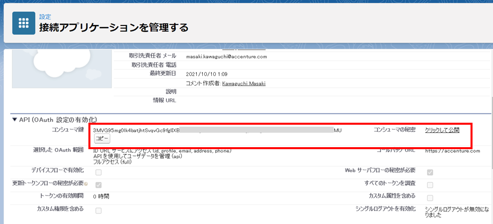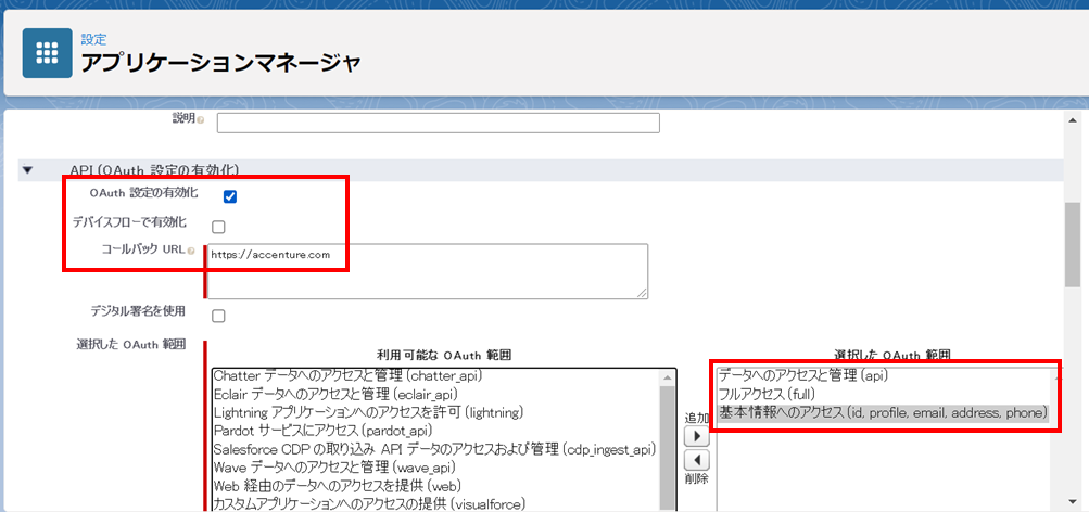 - OAuth認証を利用する接続アプリケーションを設定する。