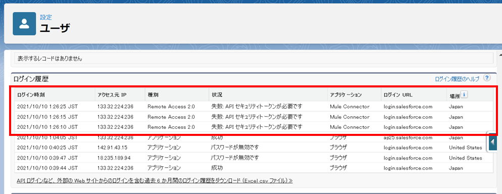 ログインに失敗した場合は、連携ユーザ画面のログイン履歴を確認しトラブルシュートする。
