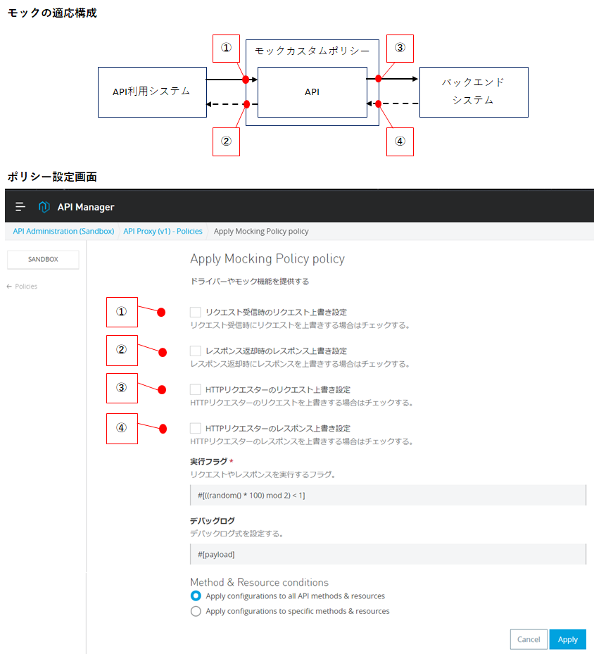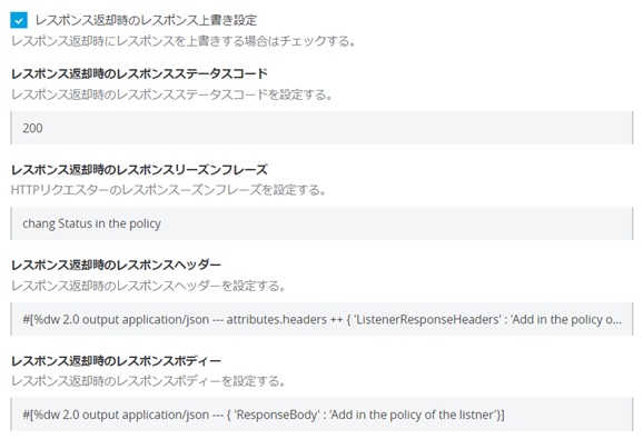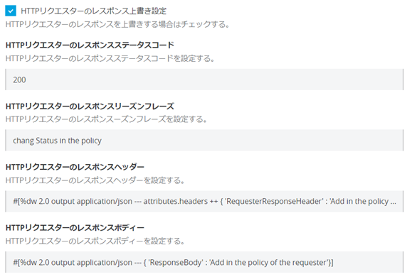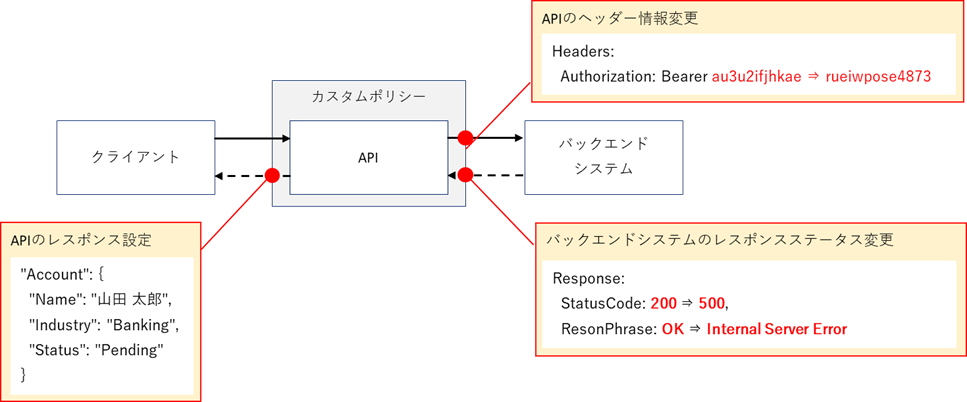 モックカスタムポリシーは、APIのリクエストとレスポンス情報を上書きするカスタムポリシーである。