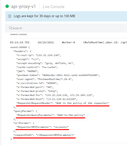 ランタイムのログで、HTTPリクエスターのリクエスト情報が上書きされていることを確認できる。