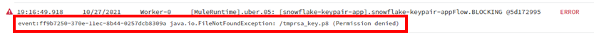 Caused by: org.mule.runtime.extension.api.exception.ModuleException: java.sql.SQLException: Cannot get connection for URL jdbc:snowflake://XXXXX.ap-northeast-1.aws.snowflakecomputing.com/?warehouse=COMPUTE_WH&db=SNOWFLAKE_SAMPLE_DATA&private_key_file=rsa_key.p8 : Private key provided is invalid or not supported: rsa_key.p8: rsa_key.p8