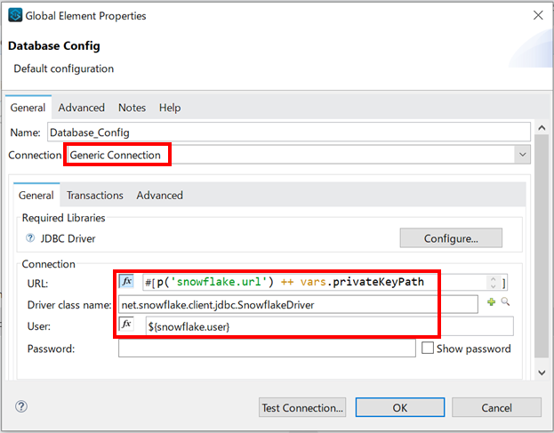 Snowflake Connectorは、キーペア認証をサポートしていないため、Database Connectorを利用して接続する。