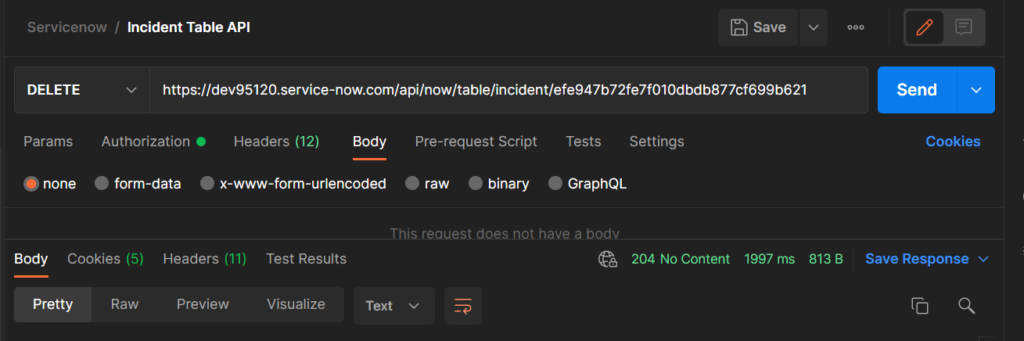 URL: DELETE https://{instance-id}.service-now.com/api/now/table/incident/{sys_Id}