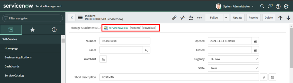 ServiceNowの画面から添付ファイルがアップロードされていることを確認できる。