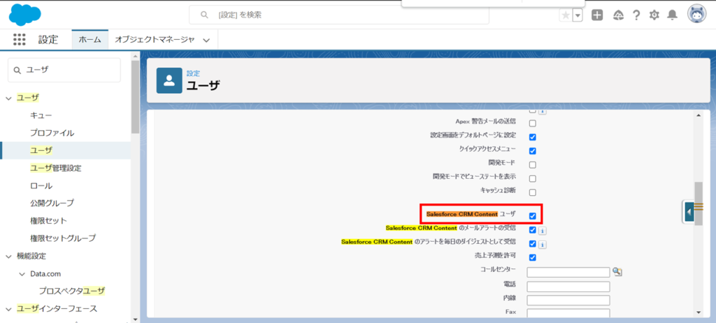 [Salesforce CRM Content ユーザ]権限を付与する。
