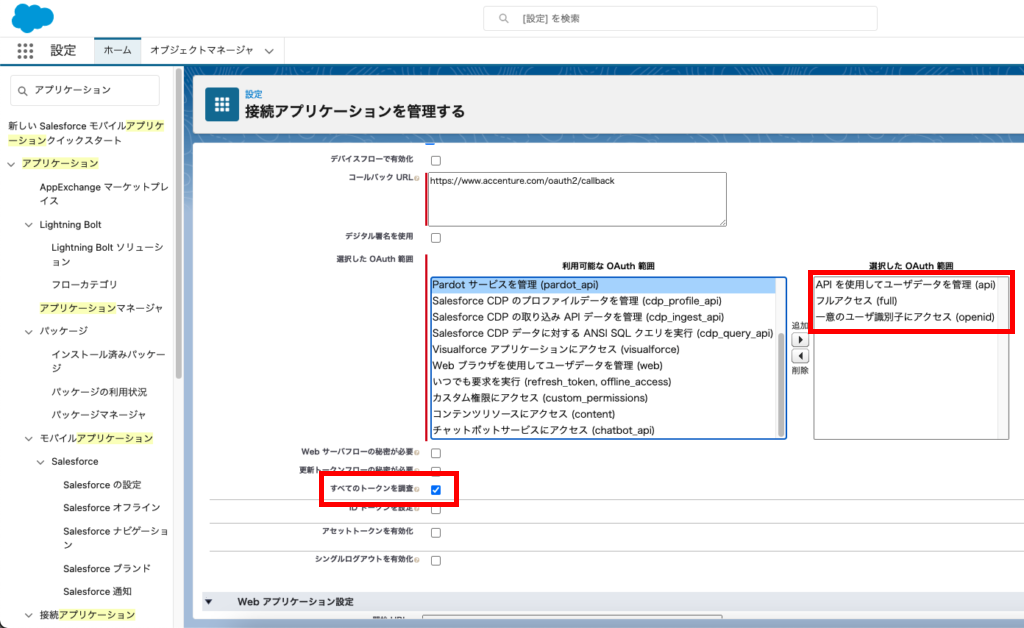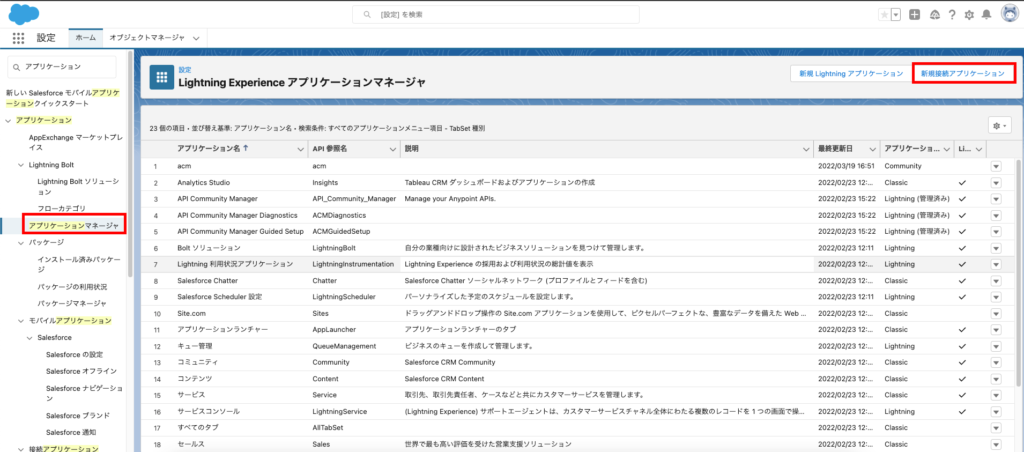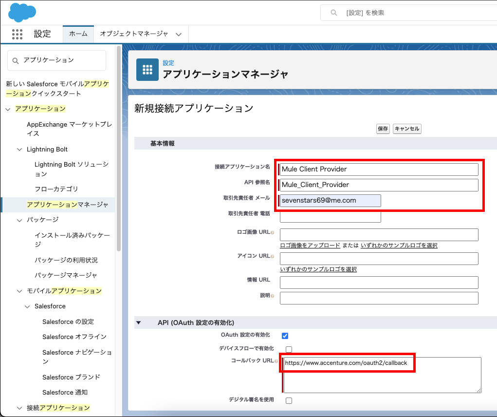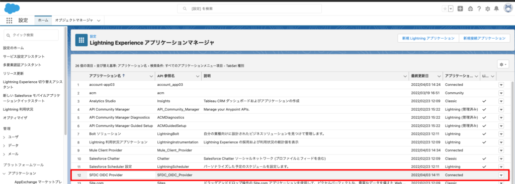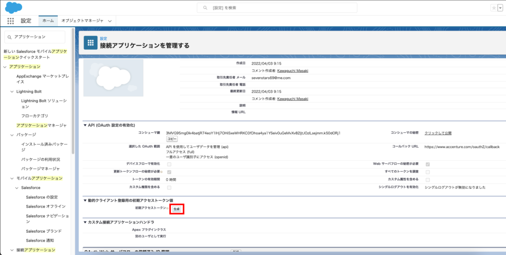 Muleのクライアントアプリケーションを登録すると、SFDCの接続アプリケーションも作成される。