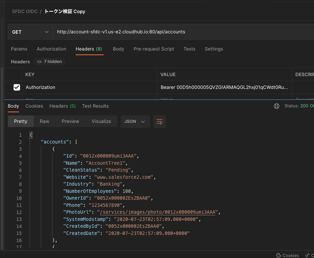 SFDCの認証で発行したアクセストークンを利用してMuleのAPIのレスポンスを受け取ることができた。