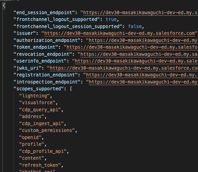 “https://<私のドメイン名>-dev-ed.my.salesforce.com/.well-known/openid-configuration”