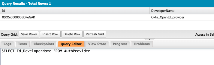 下記のApexトリガーのSalesforceのAuth.AuthToken.getAccessTokenで利用するOktaの18桁の認証プロバイダIDを、SOQLを実行して取得する。