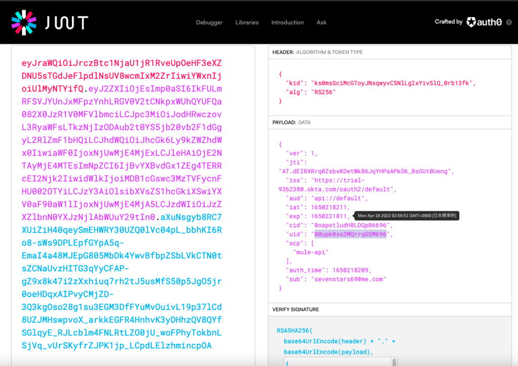 OktaのアクセストークンはJWT形式なので中身を確認する。