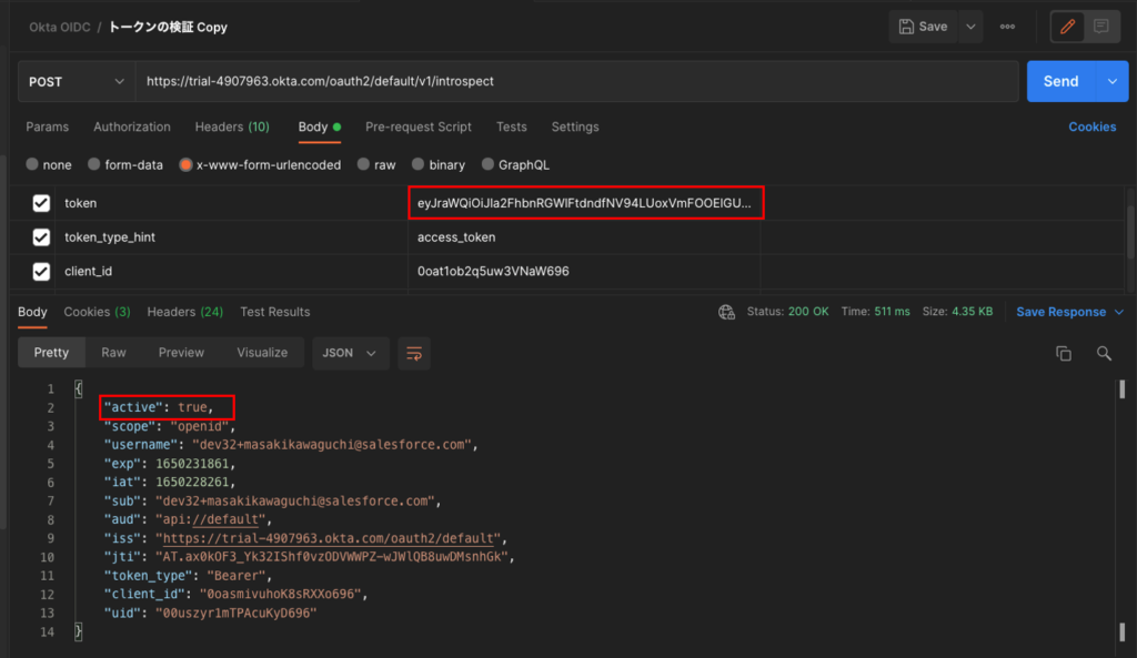 Oktaを認証プロバイダに設定しているSalesforce組織で、Salesforceが保持しているアクセストークンをOktaのトークン検証用APIで正常に動作するか確認した。