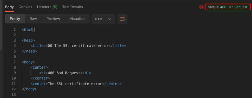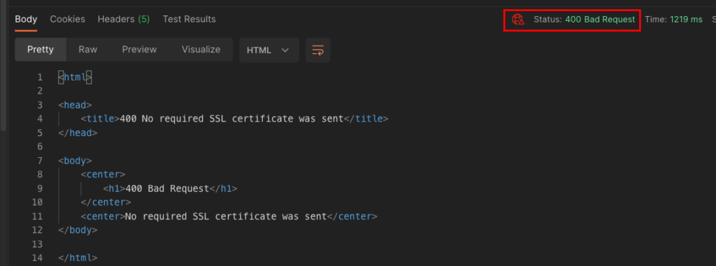 DLBのTLSクライアント認証を必須に設定した場合、POSTMANのTLSクライアント認証用の証明書を設定せずにリクエストを送信すると、認証が失敗し下記のレスポンスがPOSTMANに返却され、アプリケーションにリクエストが到達しない。