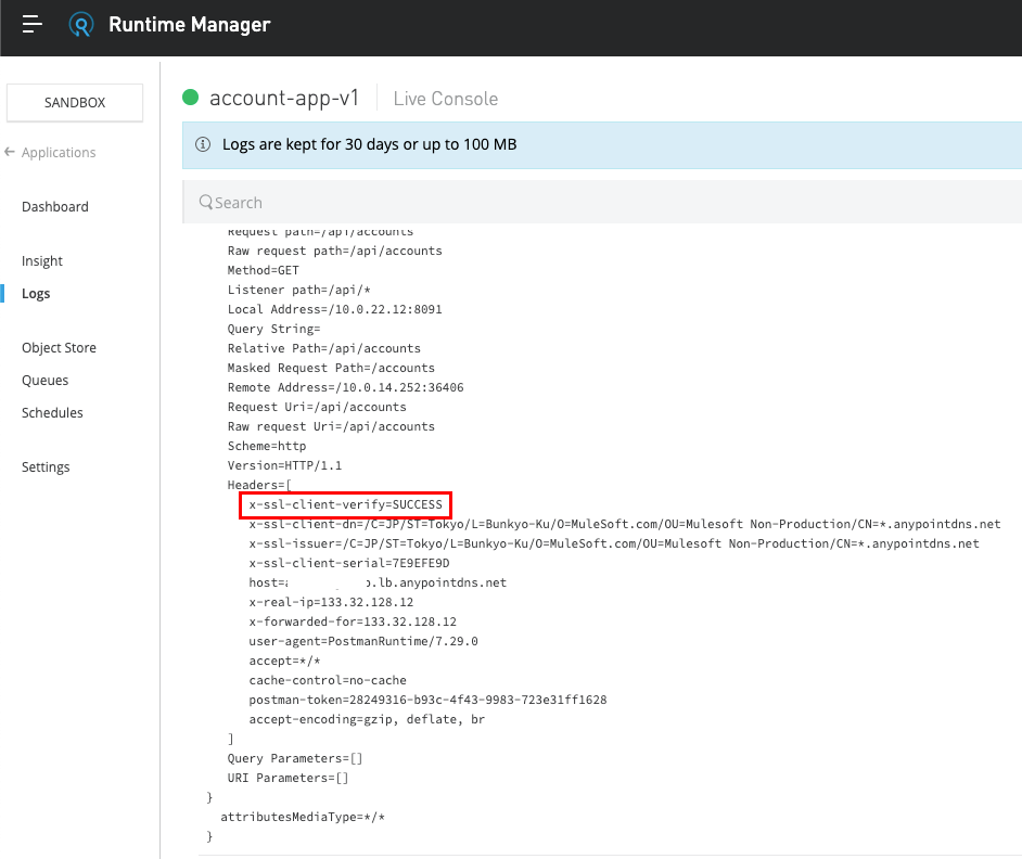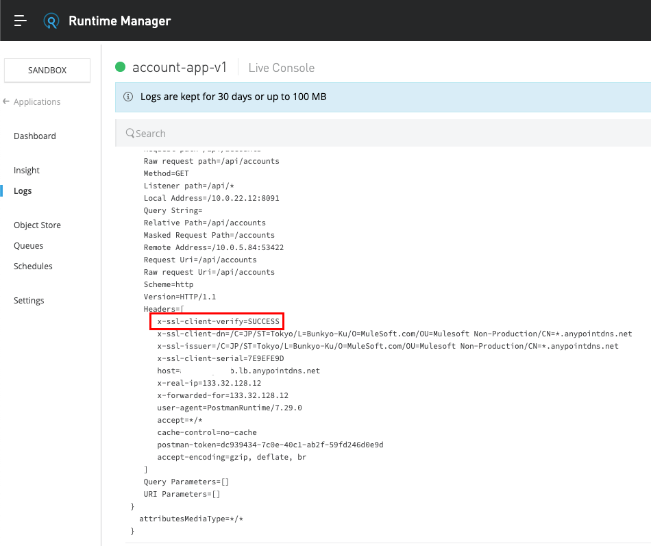 DLBのTLSクライアント認証を任意に設定した場合、POSTMANのTLSクライアント認証用証明書を正しいものに設定してリクエストを送信すると、DLBでリクエストのヘッダーに”x-ssl-client-verify=SUCCESS”が設定されてMuleアプリケーションにリクエストが到達する。