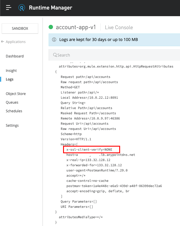 DLBのTLSクライアント認証を必須に設定した場合、POSTMANのTLSクライアント認証用の証明書を正しい証明書を設定しリクエストを送信すると、DLBで”x-ssl-client-verify=SUCCESS”が設定されてMuleアプリケーションにリクエストが到達する。