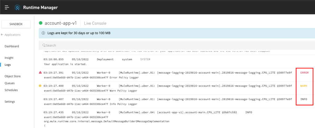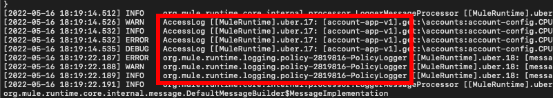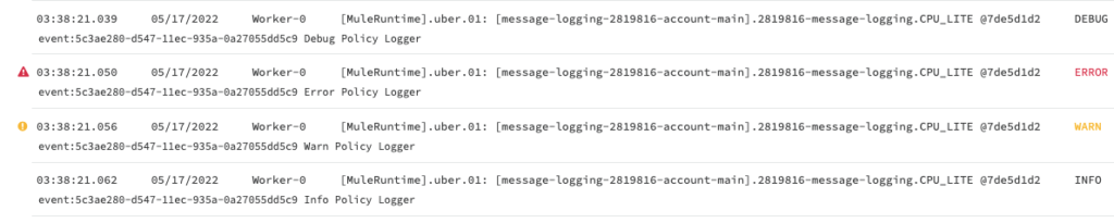 何も設定しないとMuleアプリケーションのログレベルは、INFOに設定されているため、INFO、WARN、 ERRORに設定されているログが出力される。