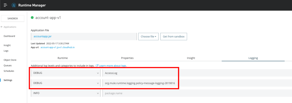 MuleのメッセージロギングポリシーやロガーコンポーネントのログをDEBUGレベルでも出力できるようにする機会があり、調べる機会があったので説明する。