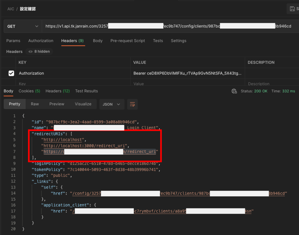 クライアント認証後にAPIクライアントの設定確認APIにアクセスし[redirectURIs]の情報をメモする。