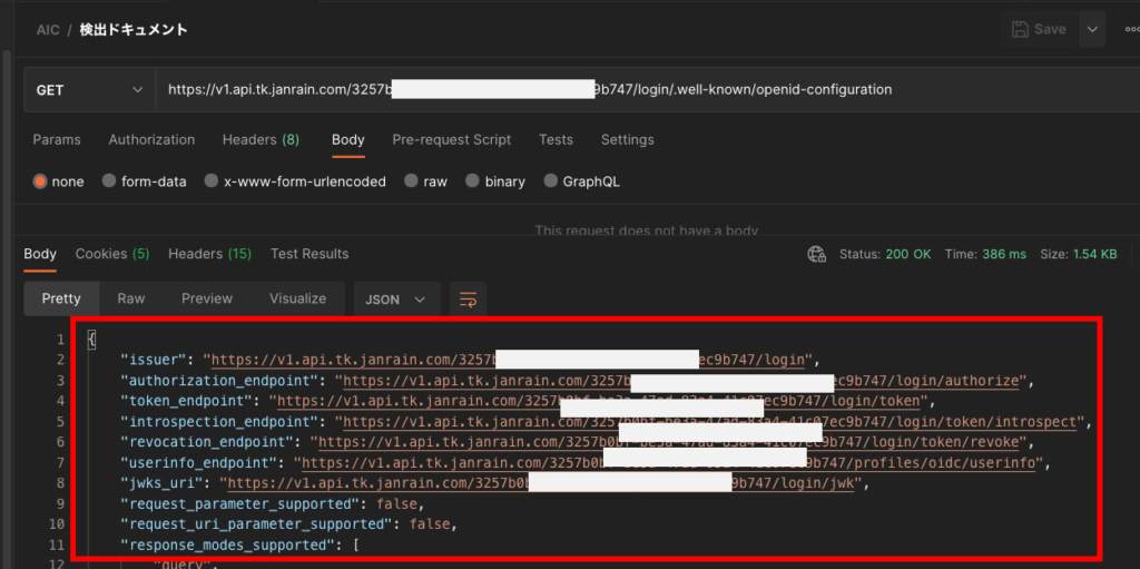 クライアント認証後にOIDC設定APIにアクセスして、クライアントプロバイダーの設定に必要な情報を確認する。[issuer]と[authorization_endpoint]、[token_endpoint]、[introspection_endpoint]をメモする。