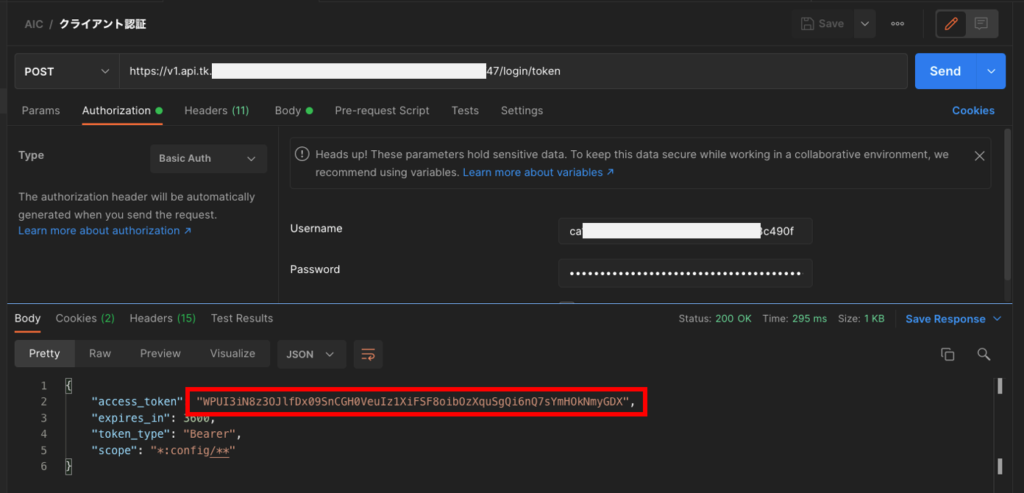 POSTMANで、クライアント認証しアクセストークンが取得できた。