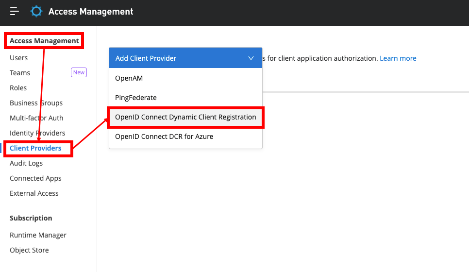 Anypoint Platformにログインして、[Access Management] > [Client Providers] > [OpenID Connect Dynamic Client Registration]を選択する。