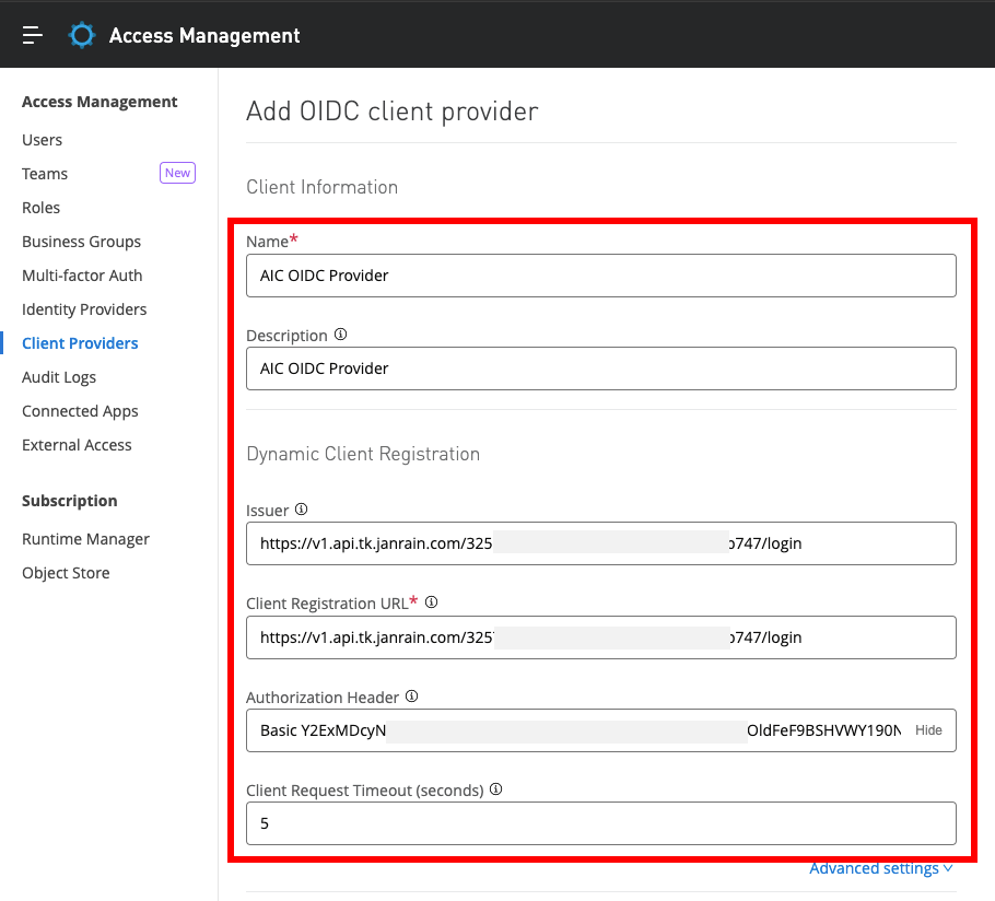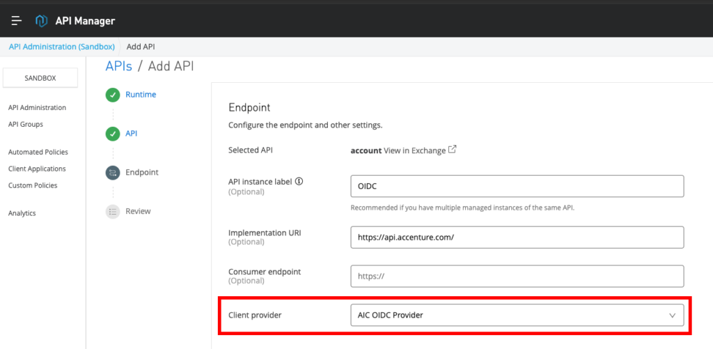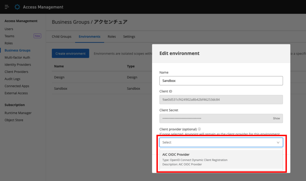 MuleSoftの[Client Provider]にAICのOpenIDプロバイダーを設定する。