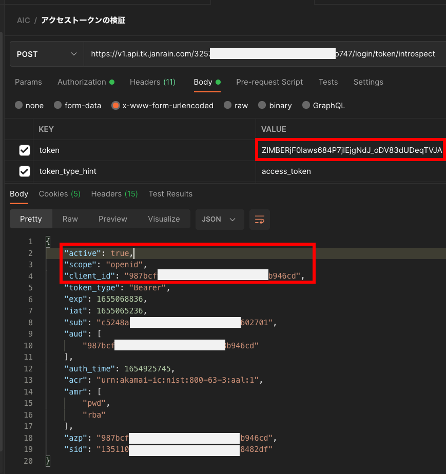 アクセストークン検証APIでアクセストークンを検証すると、認証で利用したAPIクライアントのクライアントIDと件名にログインユーザのUUIDが設定されていることが確認できた。