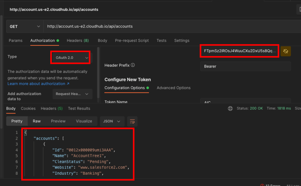 ヘッダーにアクセストークンを設定し、MuleのAPIにアクセスしたところ正常に結果が取得できたことが確認できた。