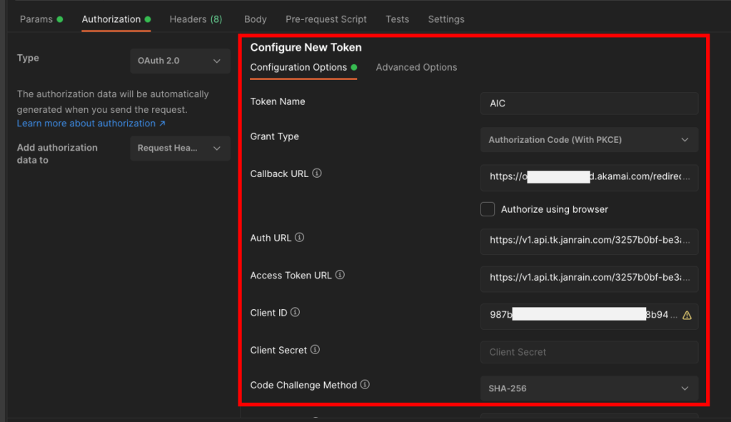 POSTMANの認証機能にAICのAuthorization Code認証方式の設定情報を設定し、アクセストークンを取得する。