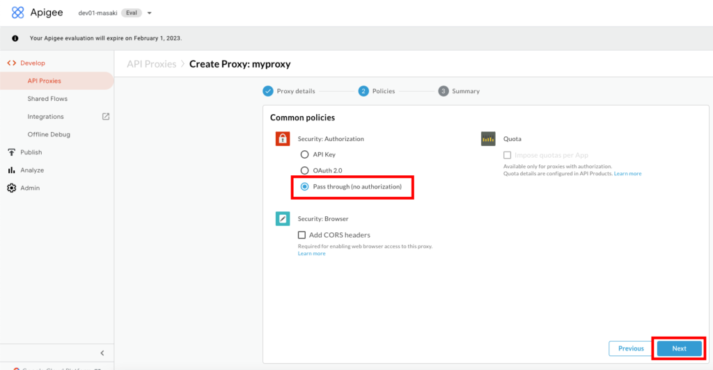 今回はまず、アクセスできることを確認したいのでAPI認証はなしに設定する。
